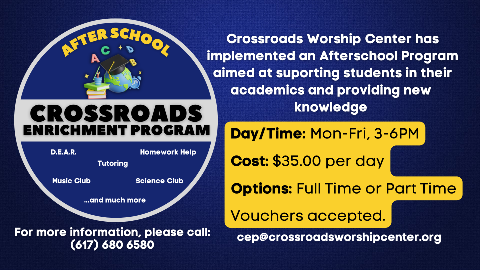 Crossroads Enrichment Program is for school aged children.. Your kids will have love coming!